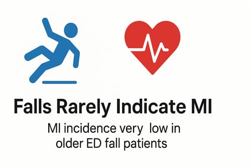 In a multicenter cohort study focusing on older patients who visited the emergency department (ED) following a fall, findings indicated that a significant portion of patients had elevated levels of high-sensitivity cardiac troponins T (hs-cTnT) and (hs-cTnI). However, the incidence of myocardial infarction (MI) among these patients was notably low. Therefore, the study suggests that falls are not a common indicator of MI, and routine high-sensitivity cardiac troponins testing might not be warranted without specific clinical suspicion.