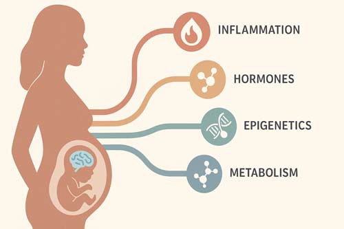 The biological mechanisms underlying this association may include chronic low-grade inflammation linked to obesity, which can elevate pro-inflammatory cytokine levels in the placenta and fetal environment. These inflammatory responses have been associated with altered brain development, neuropsychiatric disorders, and behavioral issues. Other potential mechanisms include maternal metabolic changes, vitamin D deficiency, hormonal alterations, and epigenetic modifications triggered by maternal behaviors. Despite these hypotheses, certain studies have failed to find significant links between maternal obesity and abnormal neonatal brain structures, highlighting the need for further research. For instance, studies using mediation analyses have suggested that inflammatory markers like CRP might partially explain the observed cognitive outcomes, though the direct link to intelligence remains inconclusive.