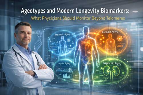 Life expectancy has roughly doubled in developed countries over the past century, yet healthspan lags far behind. By 2050, the global population aged 60 and above will reach 2.1 billion. Therefore, ageotypes—Stanford researcher Michael Snyder’s framework identifying four distinct aging patterns (metabolic, immune, hepatic, and nephrotic)—offer physicians a personalized approach to longevity assessment. While telomere length alone provides limited insight, integrating ageotypes with multi-marker panels enables clinicians to target the aging process itself rather than individual age-related diseases.