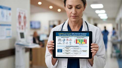 Antibiotics for H. pylori face an escalating challenge as approximately 20% of initial treatment attempts result in eradication failure. Standard H. pylori triple therapy has declined in efficacy globally, with clarithromycin-based regimens now achieving eradication rates below 80%. In fact, no regimen demonstrates a 100% cure rate. This article examines why conventional H. pylori treatment fails, reviews current H. pylori treatment guidelines, and evaluates evidence-based salvage protocols. Specifically, it covers H. pylori quadruple therapy and rescue regimens, providing physicians with practical strategies for managing refractory infections and selecting the most effective antibiotics for H. pylori eradication.